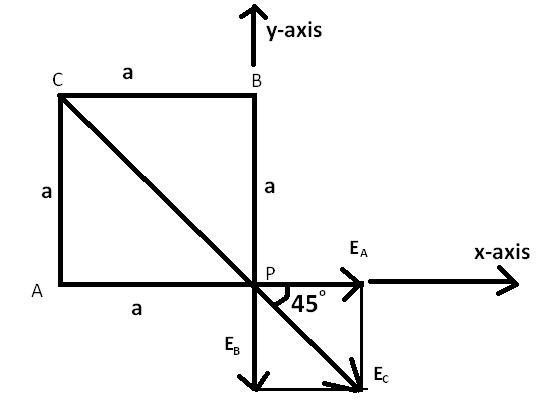 ![\vec E = \vec E_A+\vec E_B +\vec E_C\\=\dfrac{kq}{a^2}\hat i+\dfrac{kq}{a^2}(-\hat j)+\dfrac{kq}{2a^2}\ \dfrac{1}{\sqrt 2}(\hat i-\hat j).\\=\left ( \dfrac{kq}{a^2}+\dfrac{kq}{2\sqrt 2\ a^2} \right )\hat i+\left (\dfrac{kq}{a^2}+\dfrac{kq}{2\sqrt 2\ a^2} \right )(-\hat j)\\=\dfrac{kq}{a^2}\left [\left ( 1+\dfrac{1}{2\sqrt 2} \right )\hat i+\left (1+\dfrac{1}{2\sqrt 2} \right )(-\hat j)\right ]\\=\dfrac{kq}{a^2}(1.353\hat i-1.353\hat j)](https://tex.z-dn.net/?f=%5Cvec%20E%20%3D%20%5Cvec%20E_A%2B%5Cvec%20E_B%20%2B%5Cvec%20E_C%5C%5C%3D%5Cdfrac%7Bkq%7D%7Ba%5E2%7D%5Chat%20i%2B%5Cdfrac%7Bkq%7D%7Ba%5E2%7D%28-%5Chat%20j%29%2B%5Cdfrac%7Bkq%7D%7B2a%5E2%7D%5C%20%5Cdfrac%7B1%7D%7B%5Csqrt%202%7D%28%5Chat%20i-%5Chat%20j%29.%5C%5C%3D%5Cleft%20%28%20%5Cdfrac%7Bkq%7D%7Ba%5E2%7D%2B%5Cdfrac%7Bkq%7D%7B2%5Csqrt%202%5C%20a%5E2%7D%20%5Cright%20%29%5Chat%20i%2B%5Cleft%20%28%5Cdfrac%7Bkq%7D%7Ba%5E2%7D%2B%5Cdfrac%7Bkq%7D%7B2%5Csqrt%202%5C%20a%5E2%7D%20%5Cright%20%29%28-%5Chat%20j%29%5C%5C%3D%5Cdfrac%7Bkq%7D%7Ba%5E2%7D%5Cleft%20%5B%5Cleft%20%28%201%2B%5Cdfrac%7B1%7D%7B2%5Csqrt%202%7D%20%5Cright%20%29%5Chat%20i%2B%5Cleft%20%281%2B%5Cdfrac%7B1%7D%7B2%5Csqrt%202%7D%20%20%5Cright%20%29%28-%5Chat%20j%29%5Cright%20%5D%5C%5C%3D%5Cdfrac%7Bkq%7D%7Ba%5E2%7D%281.353%5Chat%20i-1.353%5Chat%20j%29)