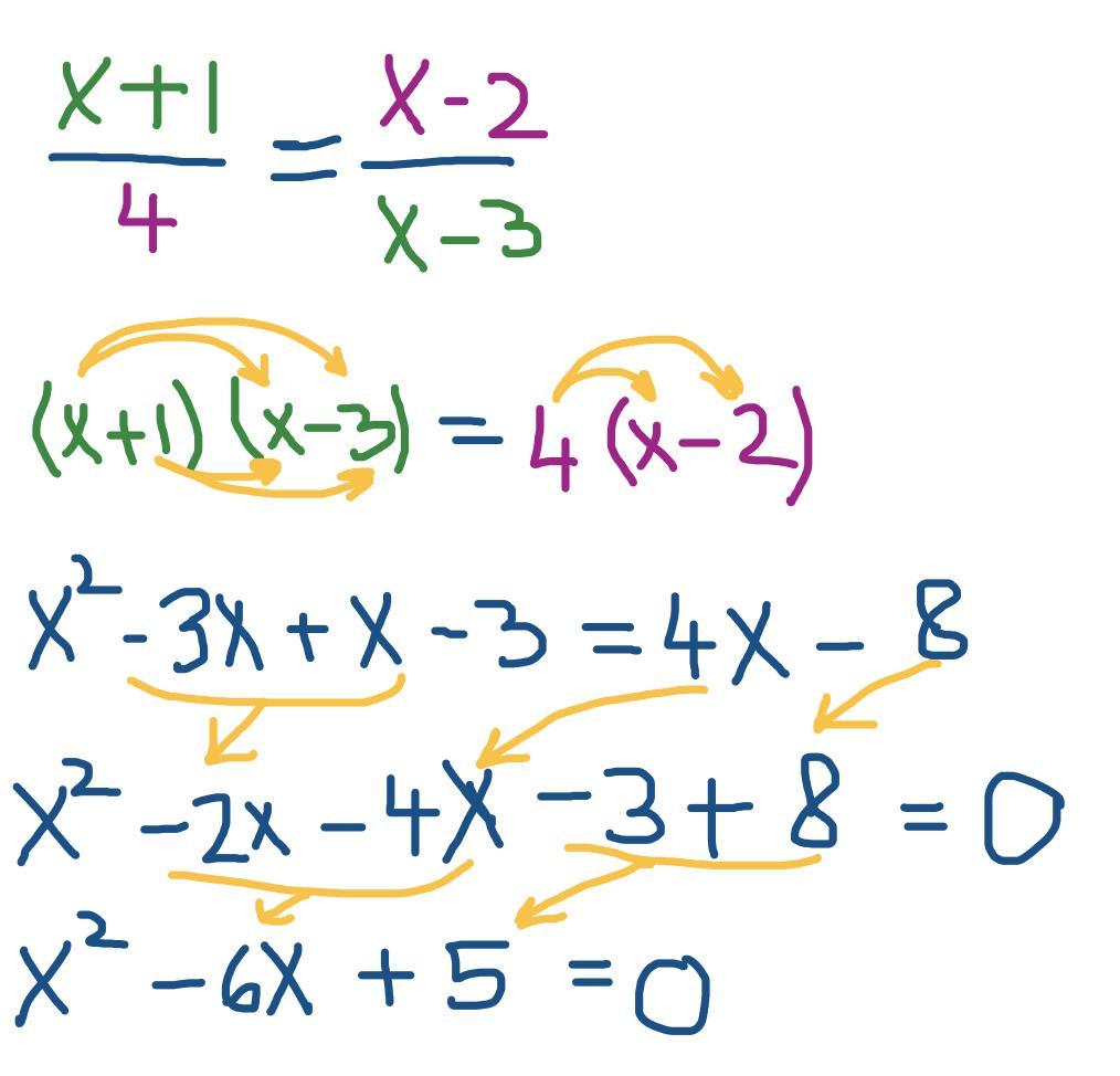 We cross multiply, distribute and combine like terms to go from fractions to a quadratic equation.