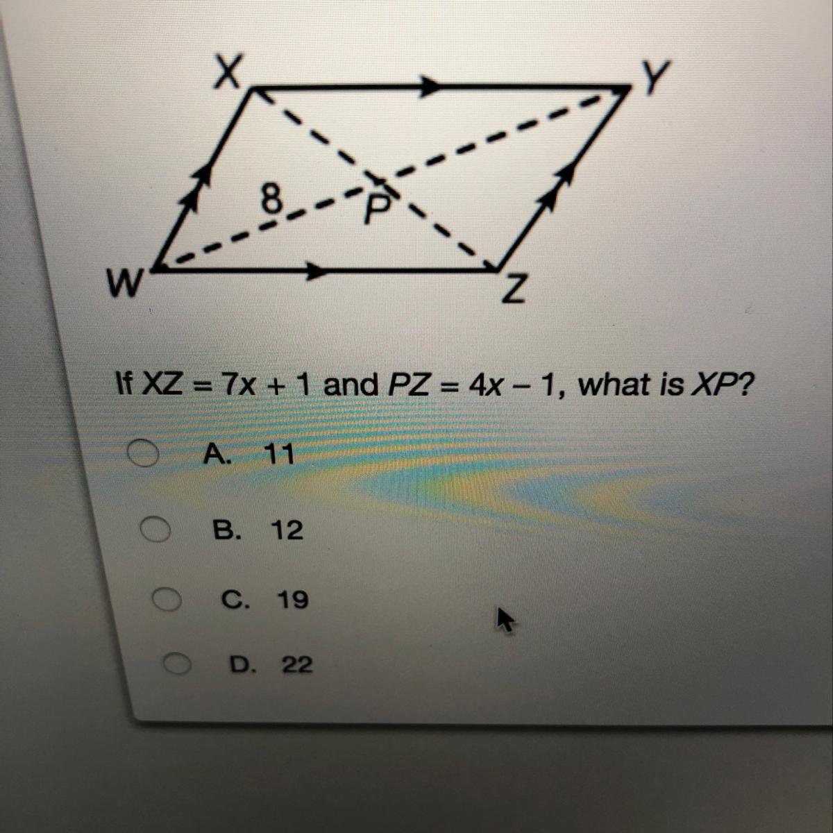 If XZ = 7x+1 and PZ = 4x-1, what is XP? ( imagine shown below please help)