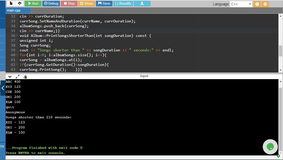If you see the main() function statement: musicAlbum.PrintSongsShorterThan(210);