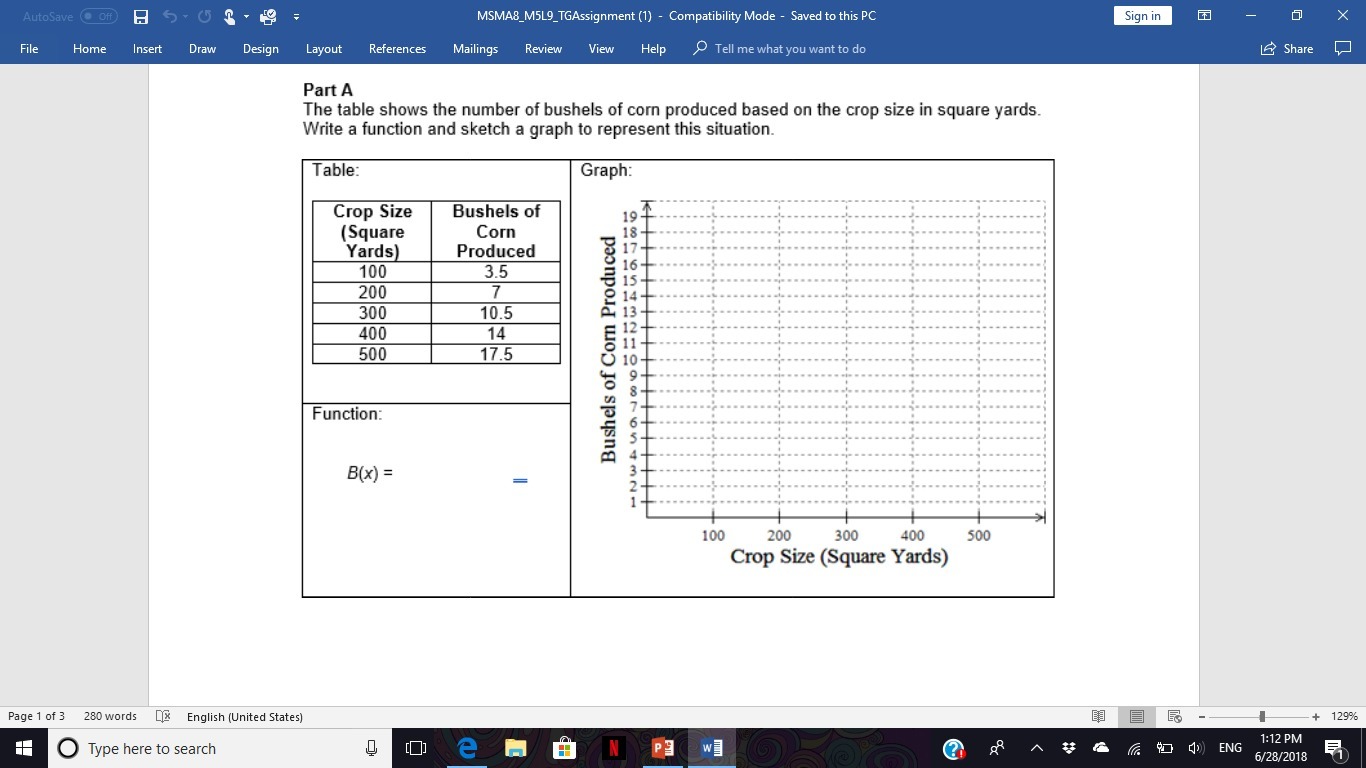 The table shows the number of bushels of corn produced based on the crop size in square yards. Write a function and sketch a graph to represent this situation. (see 1st picture) - just tell me what to write for the function, and the coordinates for the sketch