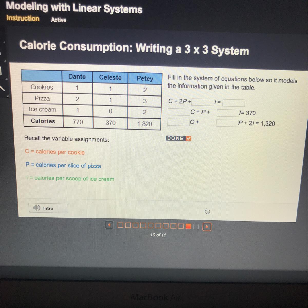 So, the three equations on the right to write a 3×3 system of equation that represents the amount of calories for Dante, Celeste and Petey