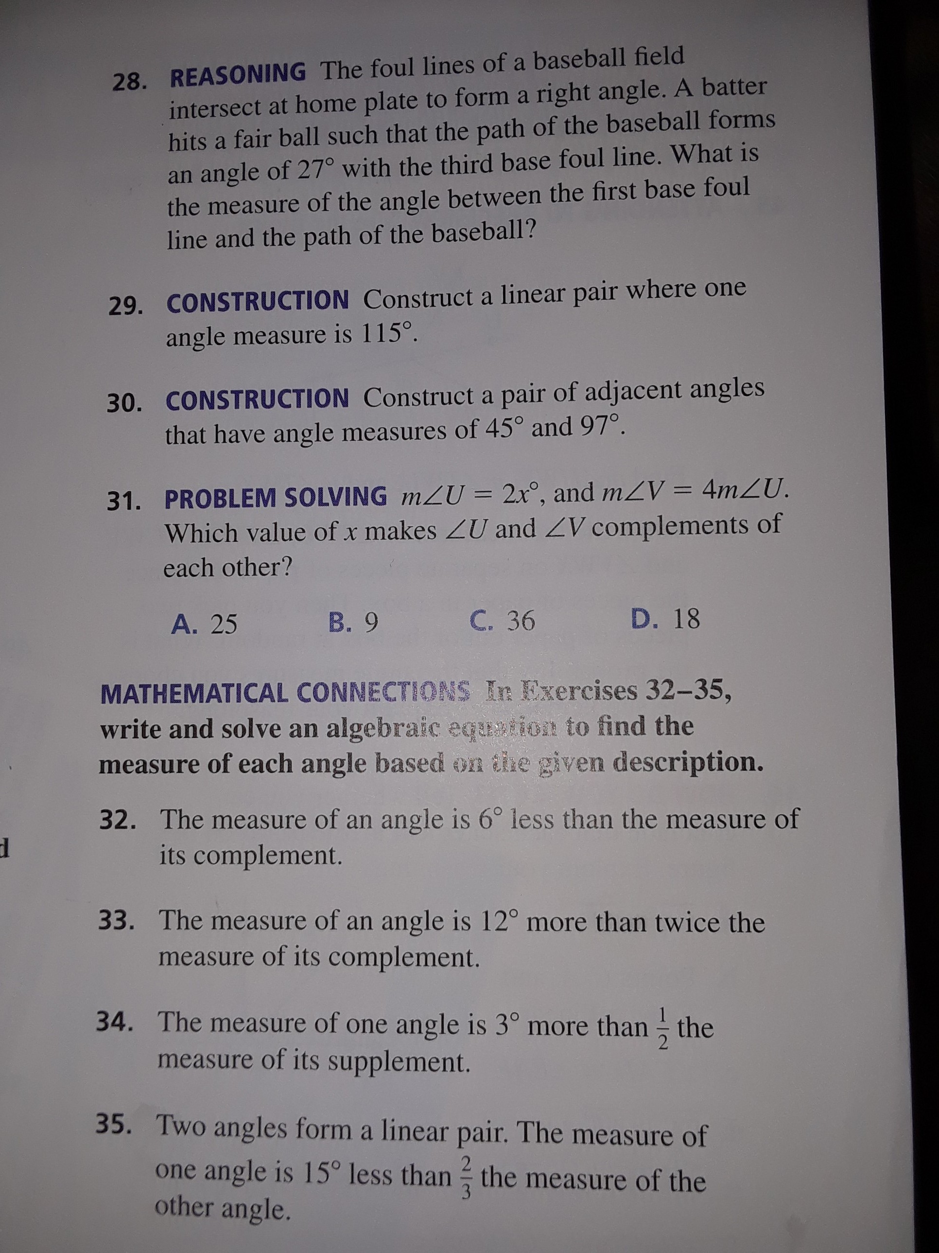 The path of any fair ball will divide the 90° angle between foul lines into complementary angles. The angle with the first-base foul line is ...