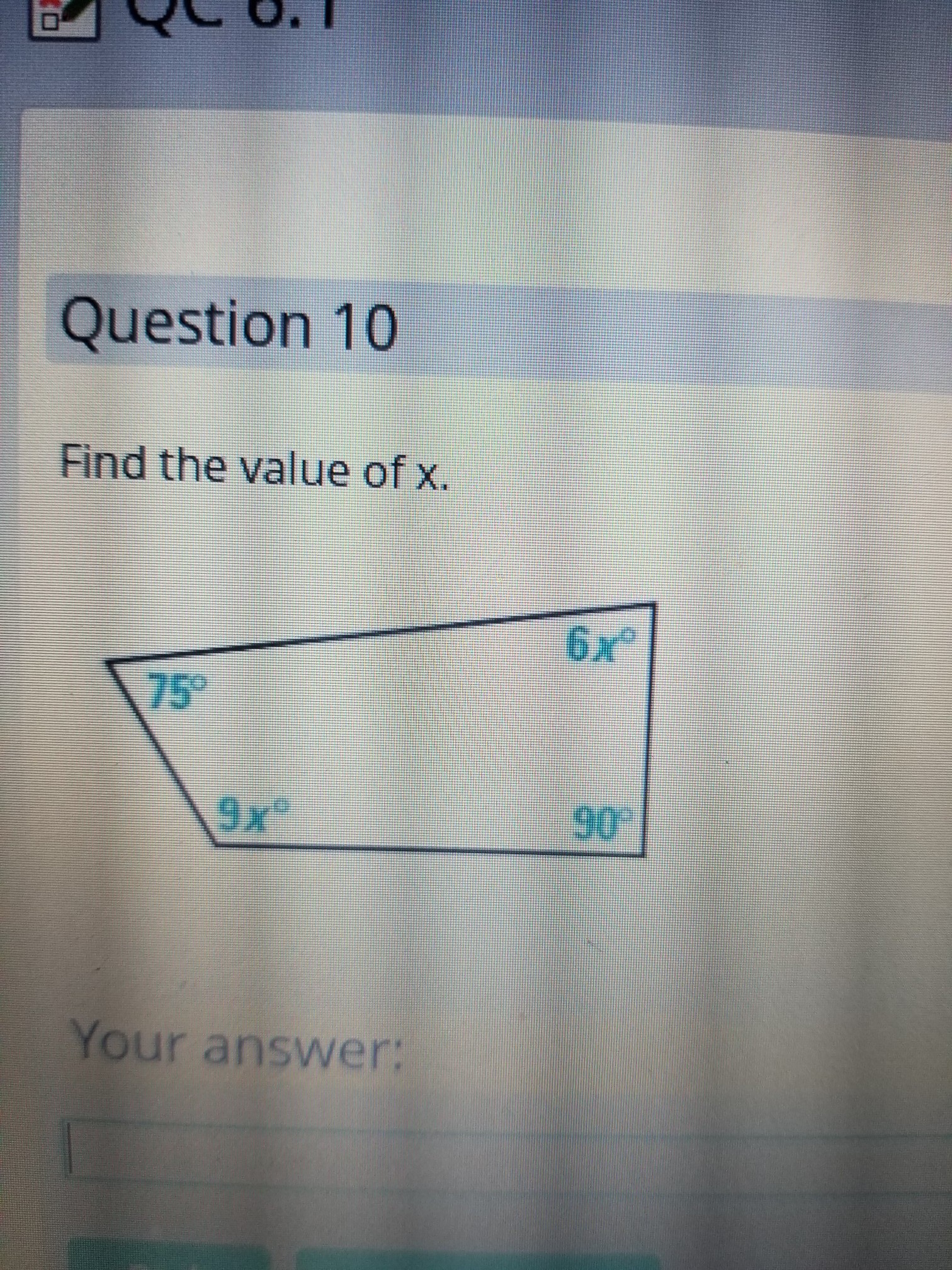 75° + 6x° + 90° +9x° = 360°