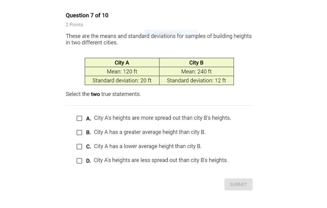 Statement A is correct, City A's heights are more spread than City B's, because. City A's standard deviation is greater than City B.