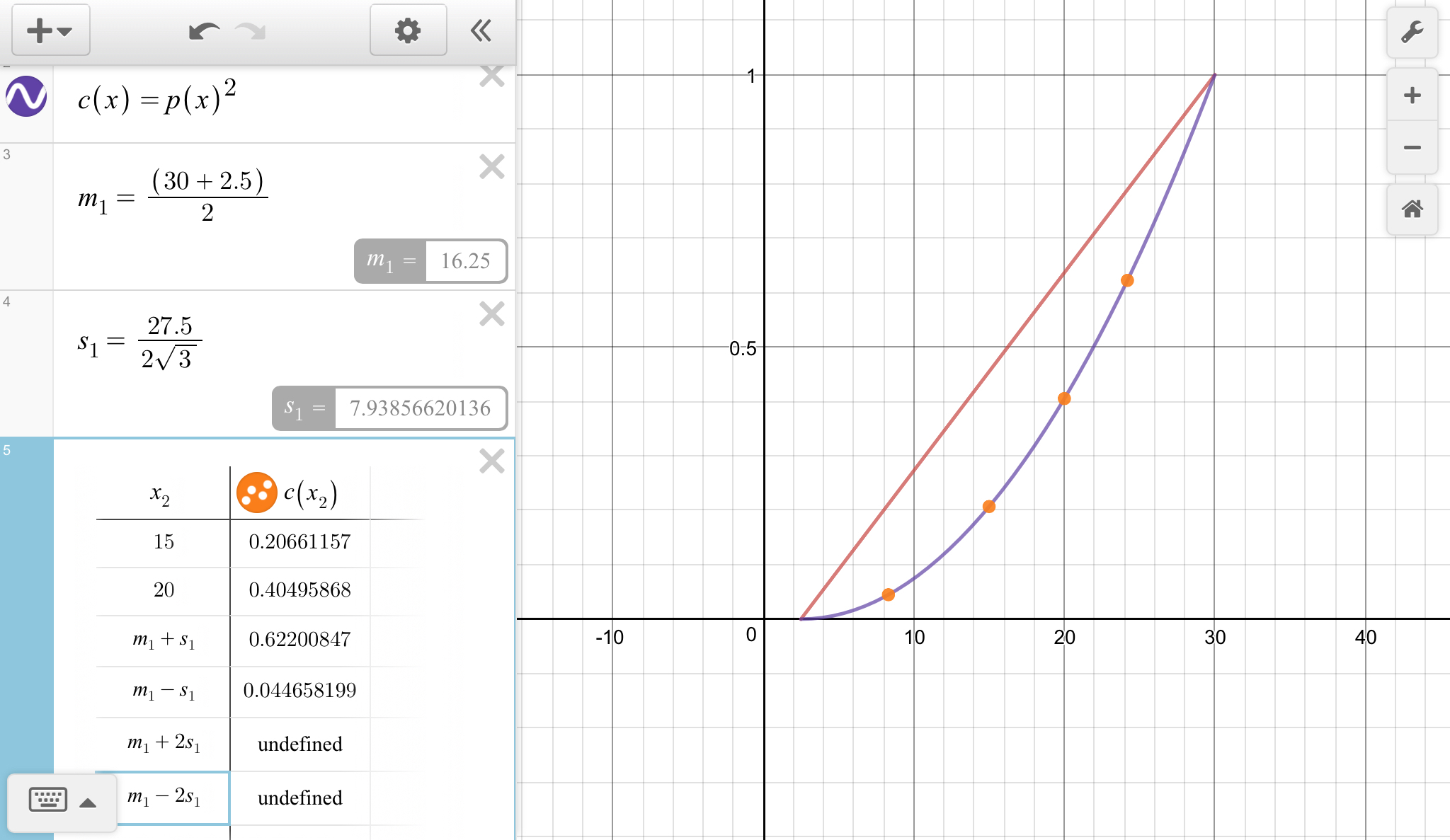 .. cdf(x) = p(x)^2 = (x -2.5)^2/756.25 . . . cumulative distribution function