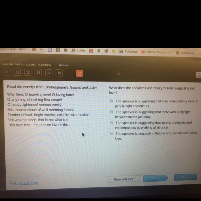The answer is likely C, as the speaker is expressing confusion and frustration with love itself.