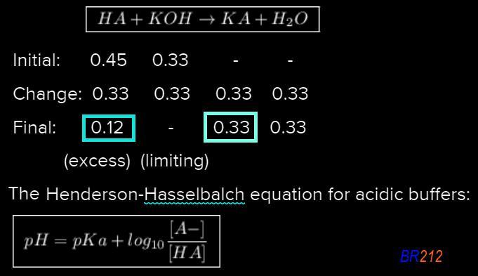 - 0.45 moles of a weak acid (HA) and 0.33 moles of KOH