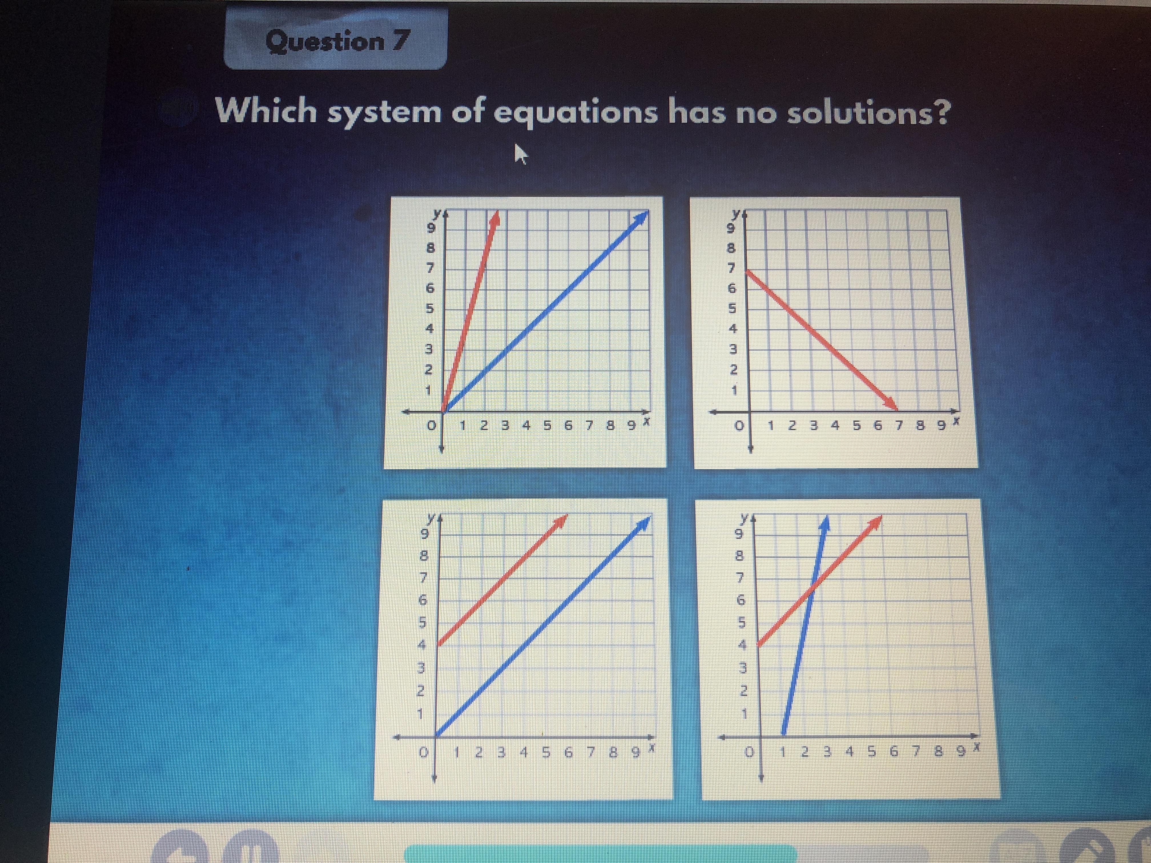 The third graph shows two parallel lines which we never expect to intersect. Since we need an intersection to find solutions, this graph is the one that corresponds to a system with no solution