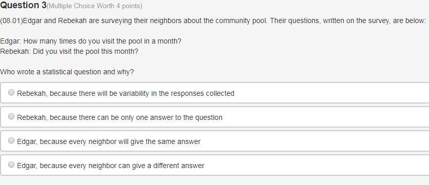 Edgar and Rebekah are surveying their neighbors about the community pool. Their questions, written on the survey, are below: