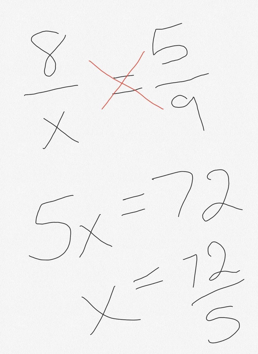 One way you can solve this is by cross multiplying. Multiply 8 and 9 together and 5 and x. You will get 5x = 72. Then you divide 72 by 5 and you will get x = 72/5.