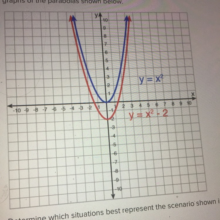 Determine which situations best represent the scenario shown in the graph of the quadratic functions, y= x^2 and y =x^2-2. Select all that apply.