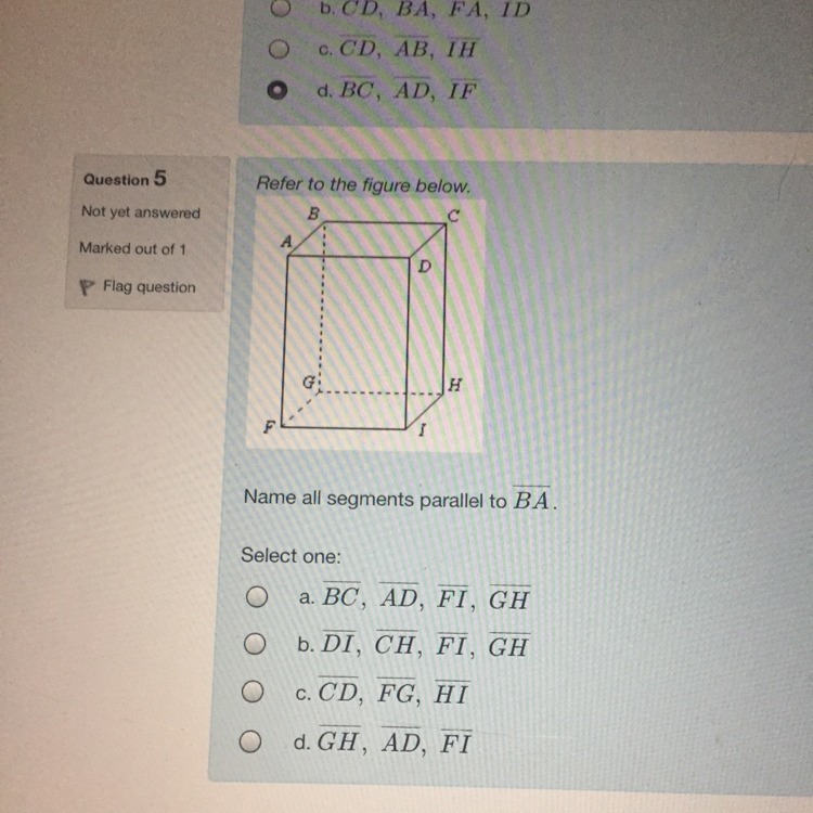 The segments CD, FG, and HI are all parallel to BA because they do not intersect. The answer is C.