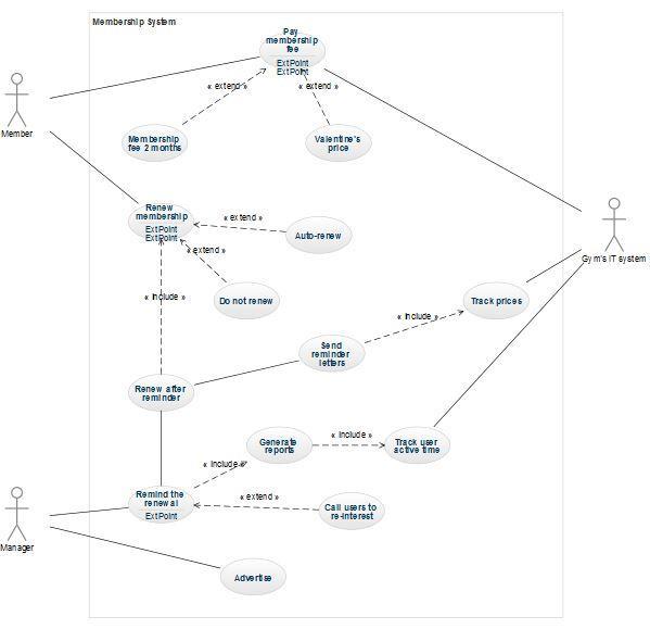 When members join the health club, they pay a fee for a certain length of time. Most memberships are for one year, but memberships as short as two months are available. Throughout the year, the health club offers a variety of discounts on its regular membership prices (e.g., two memberships for the price of one for Valentine's Day). It is common for members to pay different amounts for the same length of membership. The club wants to mail out reminder letters to members asking them to renew their memberships one month before their memberships expire. Some members have become angry when asked to renew at a much higher rate than their original membership contract, so that the clubwants to track the price paid so that the manager can override the regular prices with special prices when members are asked to renew. The system must track these new prices so that renewals can be processed accurately. One of the problems in the healthclub industry is the high turnover rate of members. While some members remain active for many years, about half of the members do not renew their memberships. This is a major problem because the health club spends a lot in advertising to attract each new member. The manager wants the system to track each time a member comes into the club. The system will then identify the heavy users and generate a report so that the manager can ask them to renew their memberships early, perhaps offering them a reduced rate for early renewal. Likewise, the system should identify members who have not visited the club in more than a month so that the manager can call them and attempt to reinterest them in the club.