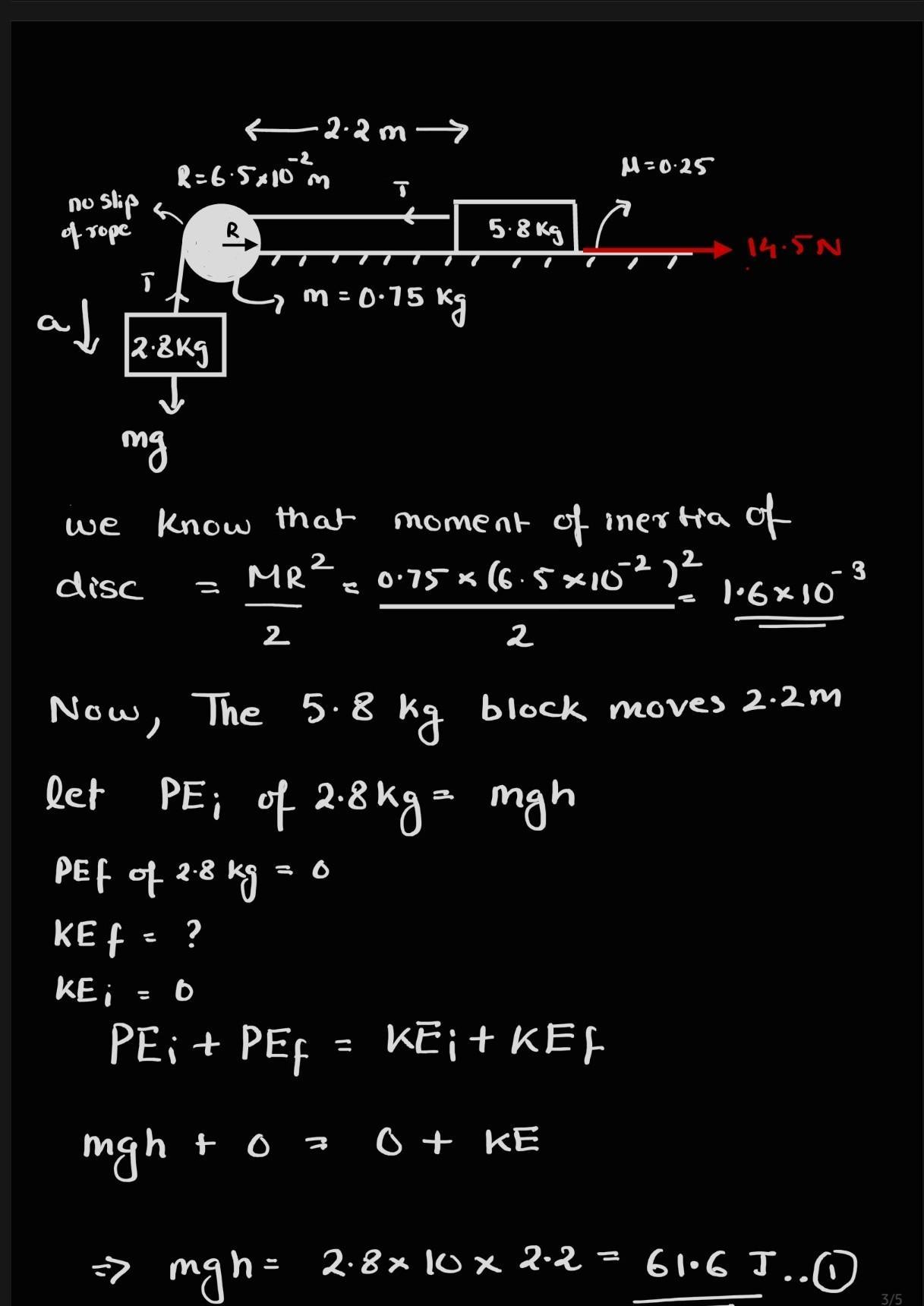 The pulley is a uniform disk with a mass of 0.75 kg and a radius of 6.5