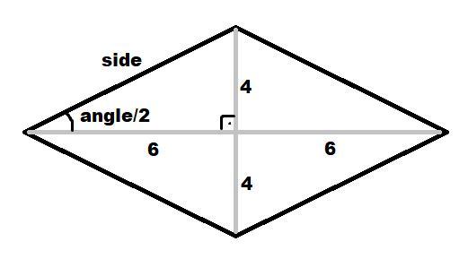 So, to find the acute angle of the rhombus, we can use the tangent relation of half this angle in the small triangle made when drawing the diagonals: