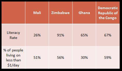 Literacy Rate was 91% in Zimbabwe yet the percentage of people living on less than $1 per day was 56%.Thus, literacy rates do not necessarily result in higher income levels.