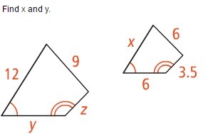 and 9 is 3/2 of 6. Therefore y would equal 6 also, x would equal 8, because 8 is 2/3 of 12, and z would equal 5 1/4.