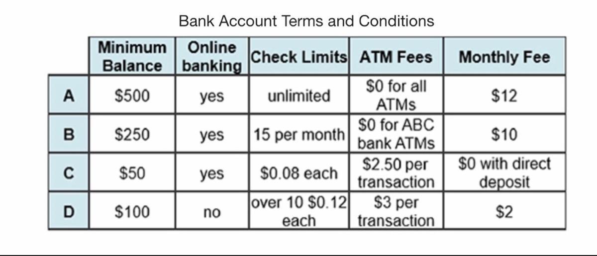 Becca has $500 to open a checking account. She wants an account with the lowest fees. She writes about 12 checks per month and h