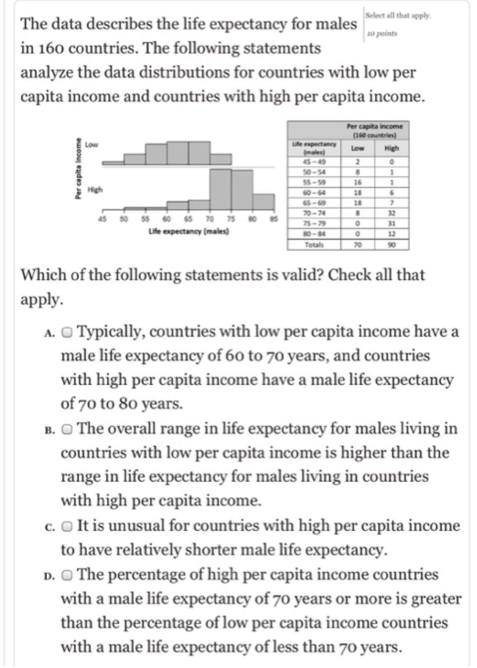 From the data attached, it is evident that the male life expectancy for high per capital income countries skews to the right with more of the values concentrated on the high male life expectancy ages and only a few on the lower end of male life expectancies.