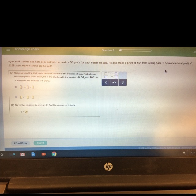First, remove the profits of the hats from the equation. 168 - 54 = 114.