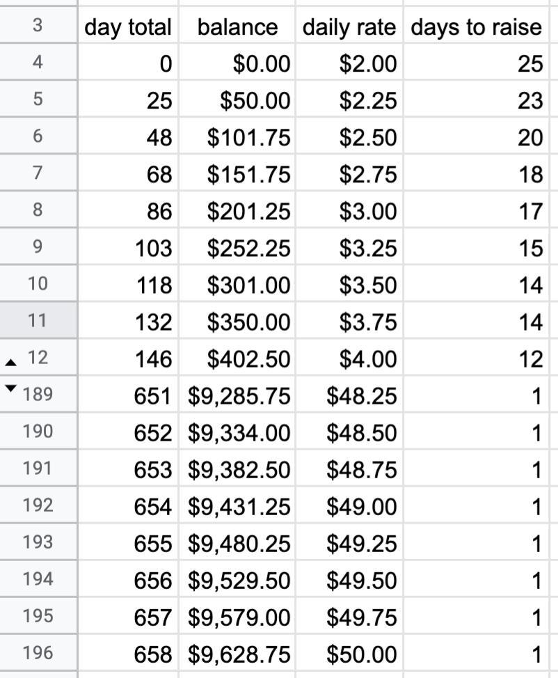 We assume the daily rate increases at each multiple of $50. When the balance reaches $50 on day 25, the pay on day 26 is $2.25.