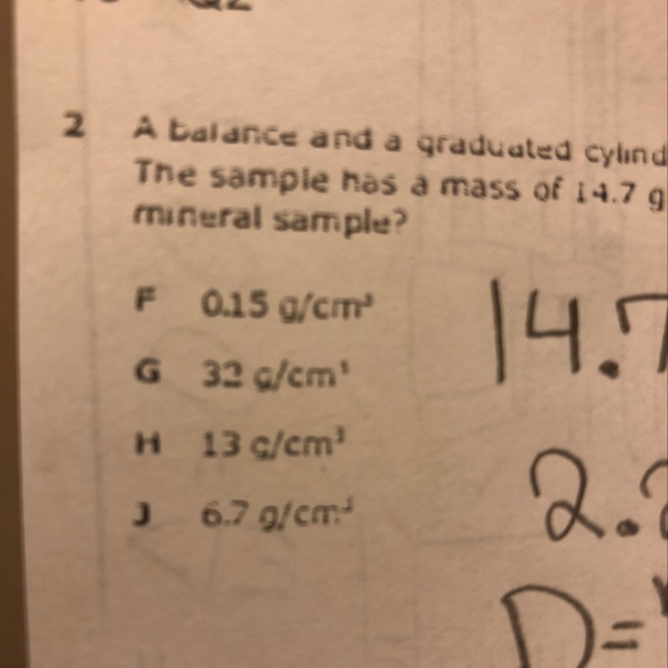 Balance and a graduated cylinder are used to determine the density of a mineral sample to sample has a mass of 14.7 g and a volu