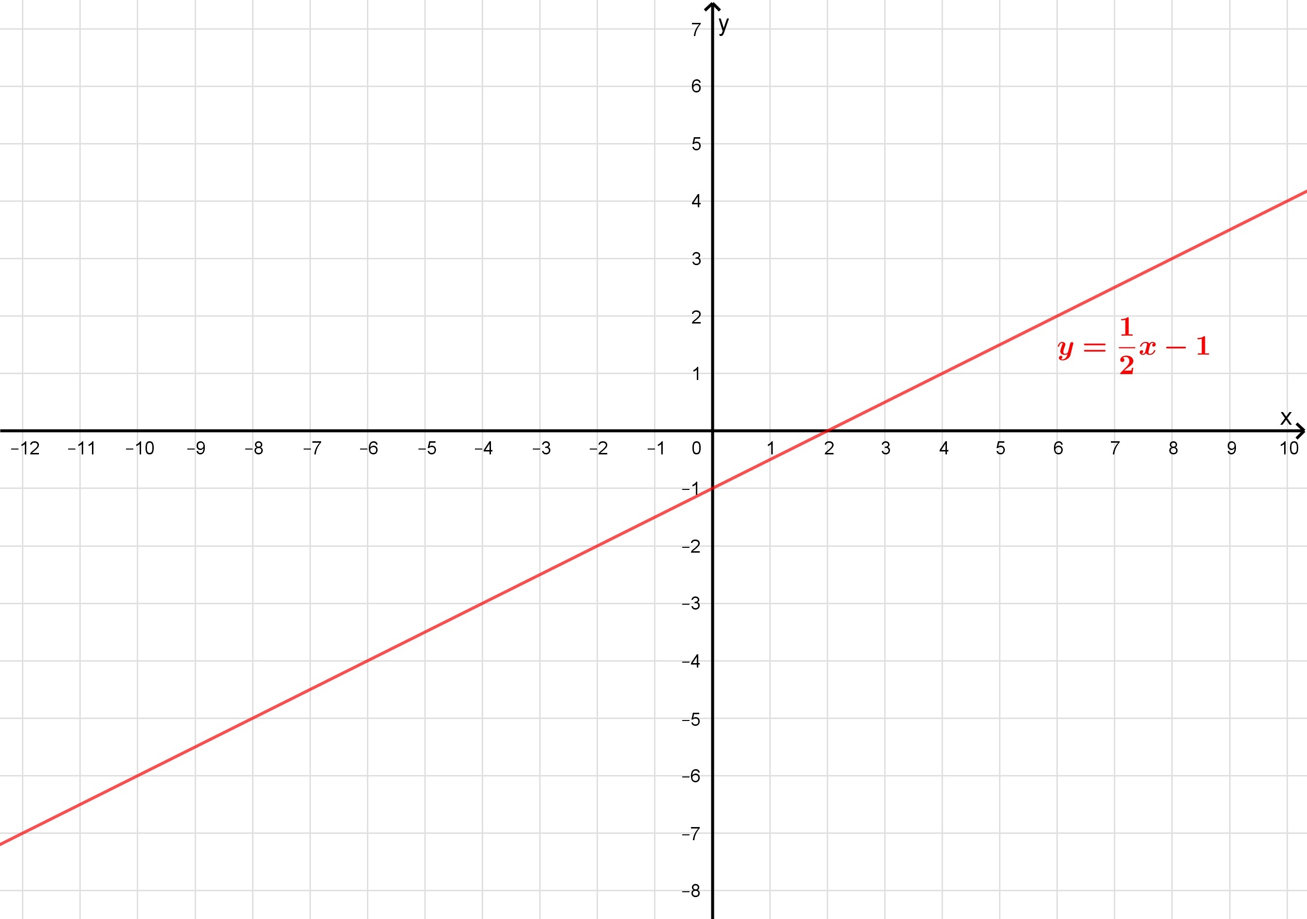 y=\dfrac{1}{2}x-1\\\\for\ x=0\to y=\dfrac{1}{2}(0)-1=-1\to(0,\ -1)\\\\for\ x=2\to y=\dfrac{1}{2}(2)-1=0\to(2,\ 0)