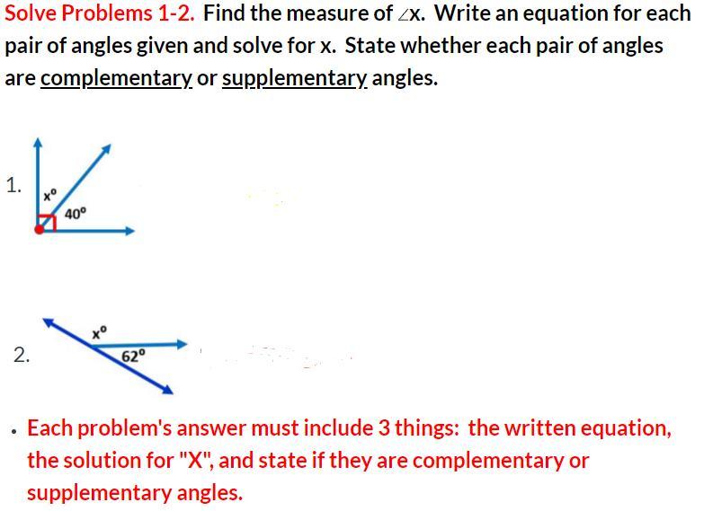 The first problem is an example of a complementary angle. To work out the value of x you would need to Minus the angle of 40 from the total of 90, this gives you 50. This is because question 1 is a right angle and so is 90°, also by subtracting the angle form the total of 90 you are isolating the value of x.