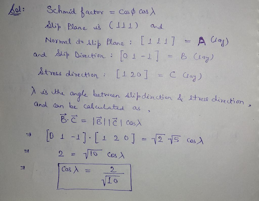 Sometimes cos ϕ.cosλ in Equation 7.2 is termed the Schmid factor. Determine the magnitude of the Schmid factor for an FCC single