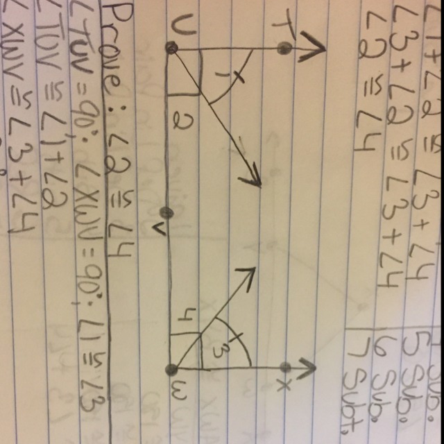 From the second and third steps, we know that m∠TUV = m∠1 + m∠2. We also know that m∠XWV = m∠3 + m∠4. Since ∠TUV and ∠XMV both measure 90°, we can set their measures equal to each other: