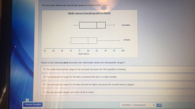 We can see from box-plot representing female grades that upper quartile is about 90 and lower quartile is about 75.