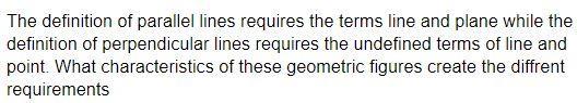The definition of parallel lines requires the terms line and plane while the definition of perpendicular lines requires the unde
