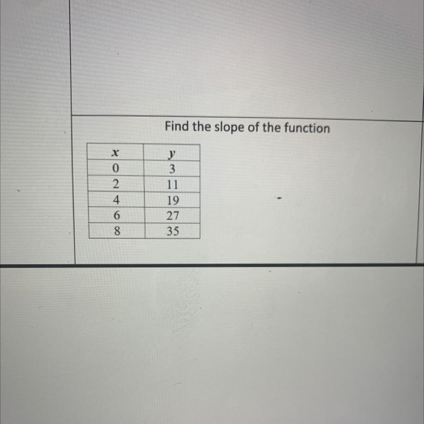 Step-by-step explanation: To find the slope, just use rise/run, or (y2-y1)/(x2-x1). All you have to do is take two points and plug that in; for example, (0, 3) and (2, 11). In the expression, it'll be (11 - 3) / 2-0 = 8/2 = 4.