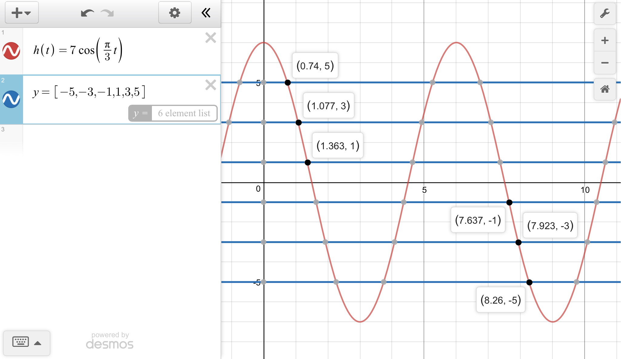 c. The period of the oscillation can be found by setting (π/3)t = 2π and solving for t. That value is t=6. Due to the symmetry of the cosine function, the times of interest for this part will be 1 1/2 periods less the times found in part b.
