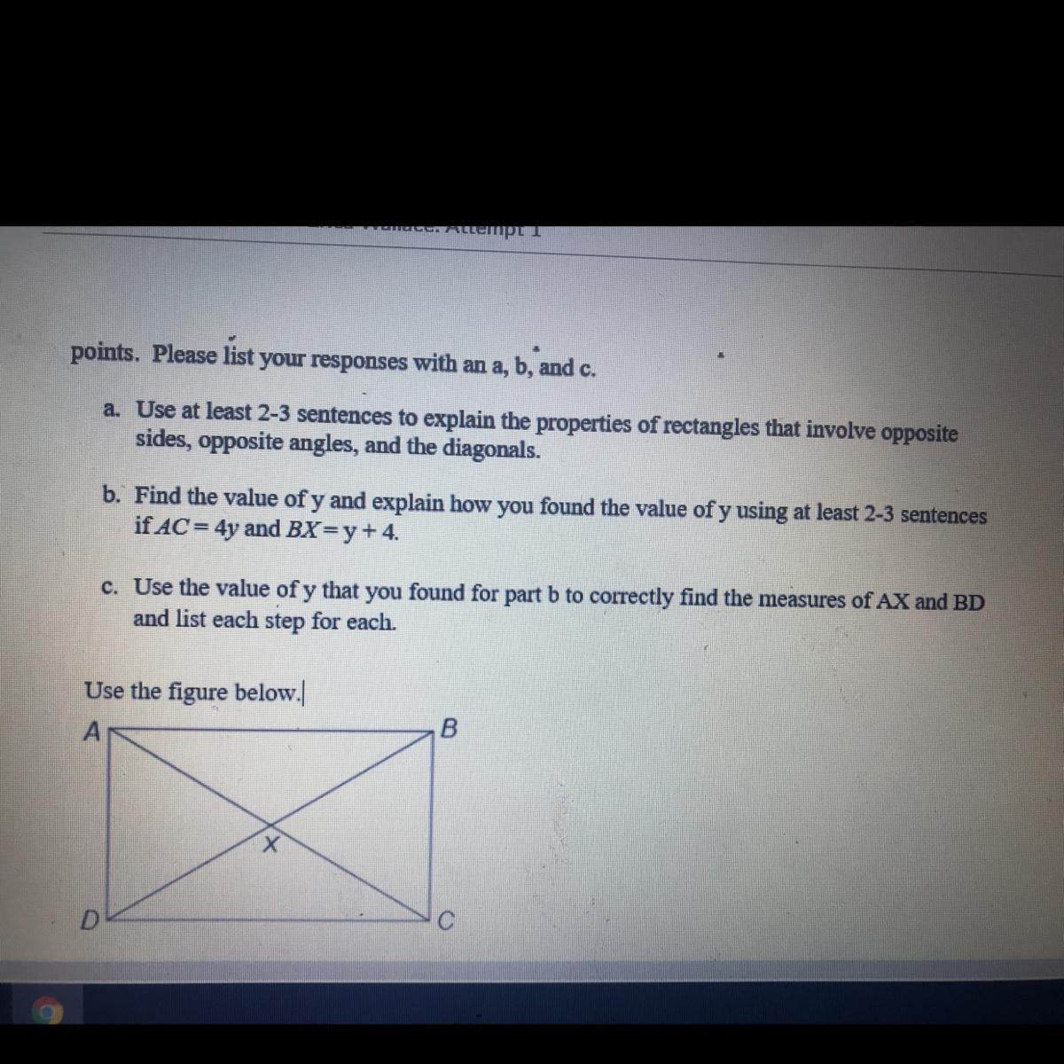 A.) Opposite sides of a rectangle are always the exact same length. Opposite angles of a rectangle are always the exact same degree. And I'm not sure what they mean by diagonals, if they mean the lines intersecting the rectangle, then they are also always the exact same length, only if they both originate in the corners of the rectangle and extend to the opposite corner