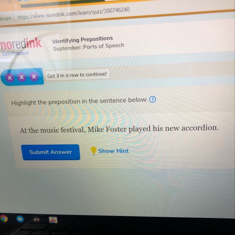 What is the preposition in this sentence? " At the music festival, Mike Foster played his new accordion. "