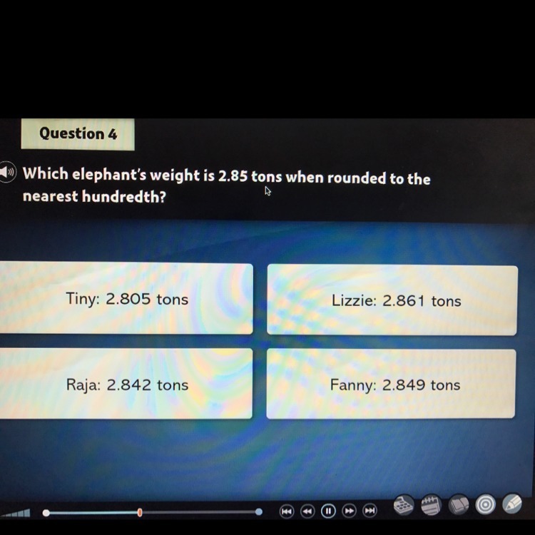 Weight of elephant = 2.85 tons when rounded to the nearest hundredths,