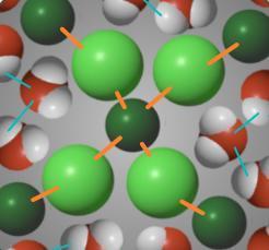 rticles are indicated by orange lines. When this substance dissolves in water, what happens to the bonds between these particles?
