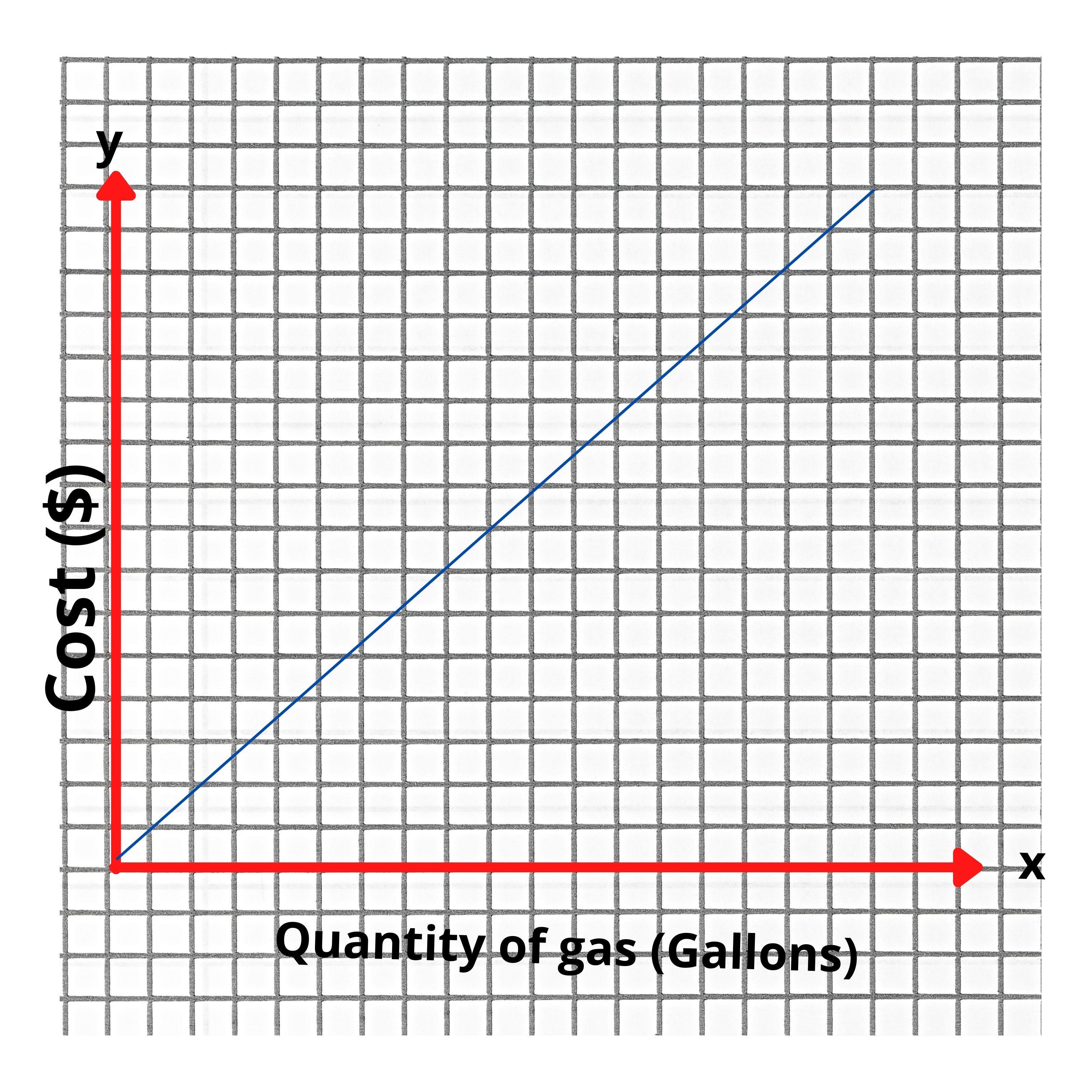 When you represent the relationship of cost of gas and quantity of gas on a graph, you will have: a proportional graph with cost ($) on the y-axis and quantity of gas (gallons) on the x-axis.