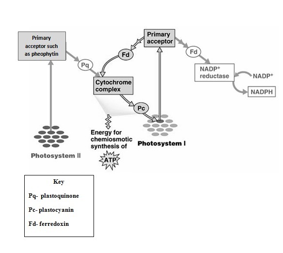 Different electron carriers (such as plastoquinone, plastocyanin, pheophytin, chlorophyll A₀ etc) are present which help in transferring this high energy electron from one complex to another. NADP⁺ is the final acceptor of the electron and gets reduced to NADPH.
