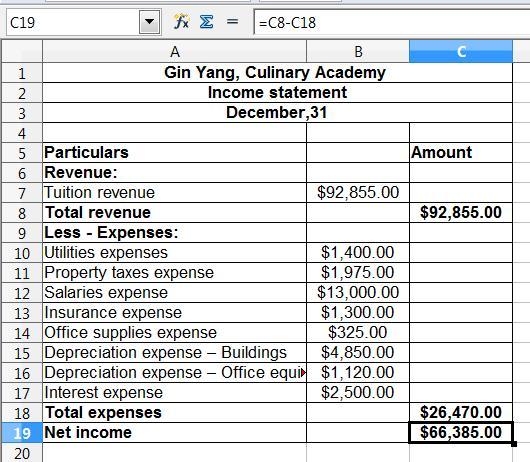 Yang, Culinary Academy. Gin Yang, Culinary Academy Adjusted Trial Balance December 31 Cash $ 5,200 Accounts receivable 1,100 Prepaid insurance 1,200 Office supplies 320 Office equipment 3,000 Accumulated depreciation–office equipment $ 1,800 Buildings 75,000 Accumulated depreciation–buildings 26,000 Land 135,000 Salaries Payable 1,285 Property taxes payable 3,200 Interest payable 3,850 Unearned tuition revenue 3,300 Notes payable 85,000 Gin Yang, Capital Stock 35,000 Gin Yang, Dividends 5,000 Tuition revenue 92,855 Salaries expense 13,000 Utilities expense 1,400 Property taxes expense 1,975 Insurance expense 1,300 Office supplies expense 325 Depreciation expense–office equipment 1,120 Depreciation expense–buildings 4,850 Interest expense 2,500 $252,290 ________ $252,290 Totals Required: Use a spreadsheet to prepare the: Income Statement Balance Sheet