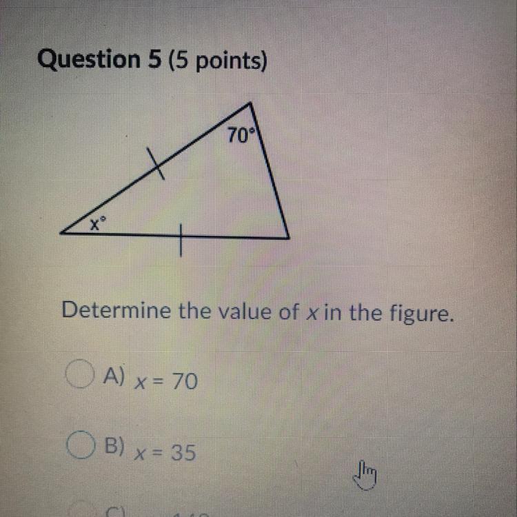 70 + 70 + x = 180 (The angle sum property of triangles)