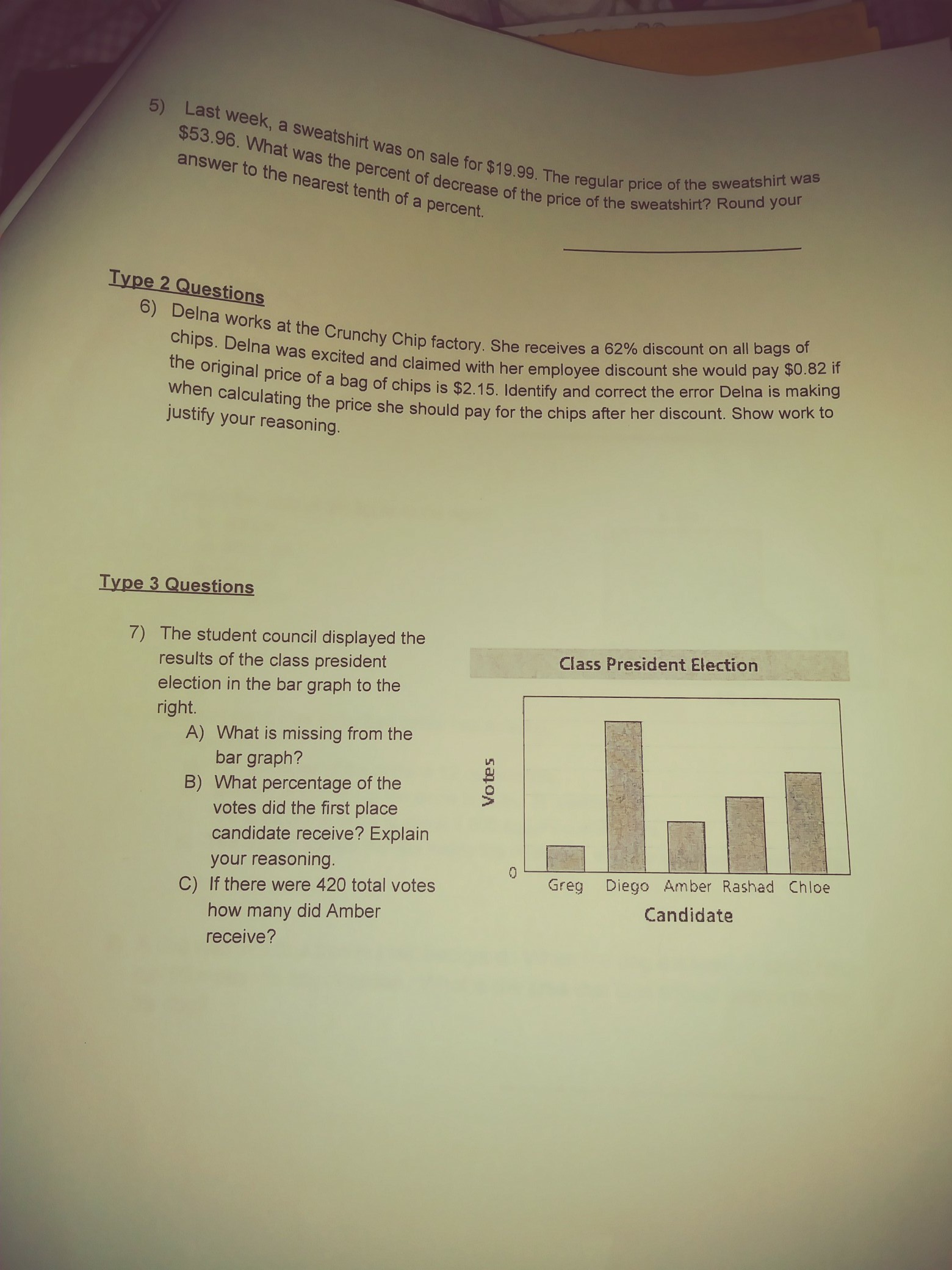 7. A) the number of votes per vertical line is missing. B) darken the vertical lines and total the number of colored squares there are then divide the number the winner got by total so 6/16 = 0.375 = 37.5% MAY NEED TO ROUND TO 38%