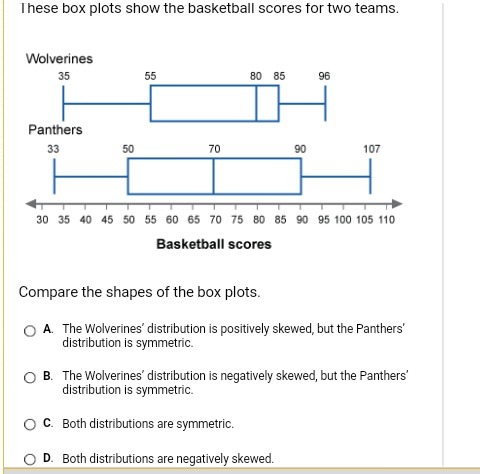 B. The Wolverines' distribution is negatively skewed but the Panthers' distribution is symmetric.