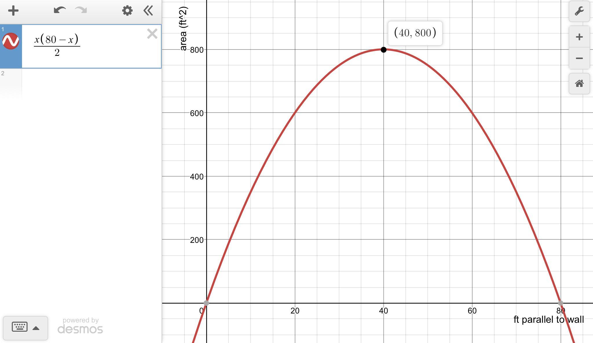 Let x represent the length of fence in the direction parallel to the wall. Then the other dimension of the rectangular pen is (80 -x)/2. The area is the product of these dimensions: