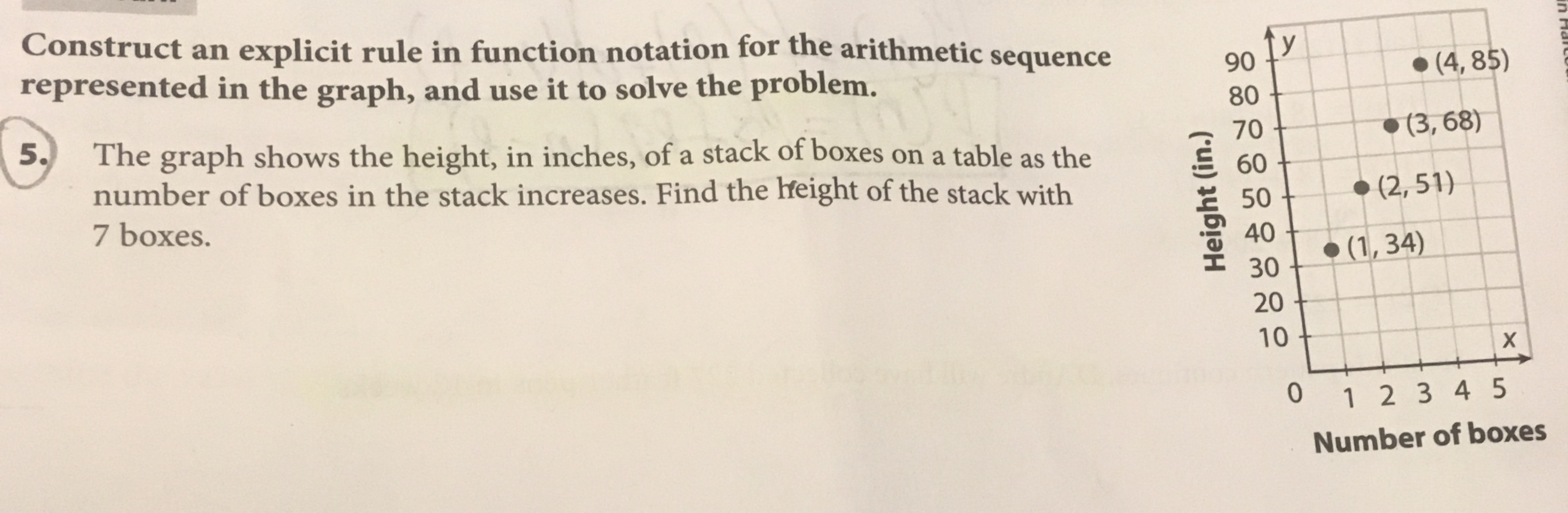 Changing the number of boxes by 1 changes the stack height by 17 inches, so the arithmetic sequence can be written as