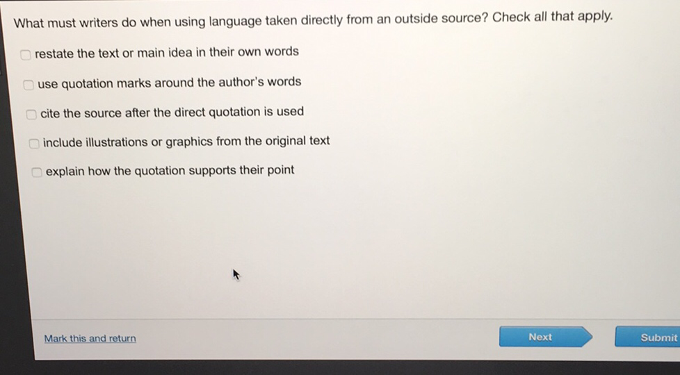 What must writers do when using language taken directly from an outside source? Check all that apply.restate the text or main id
