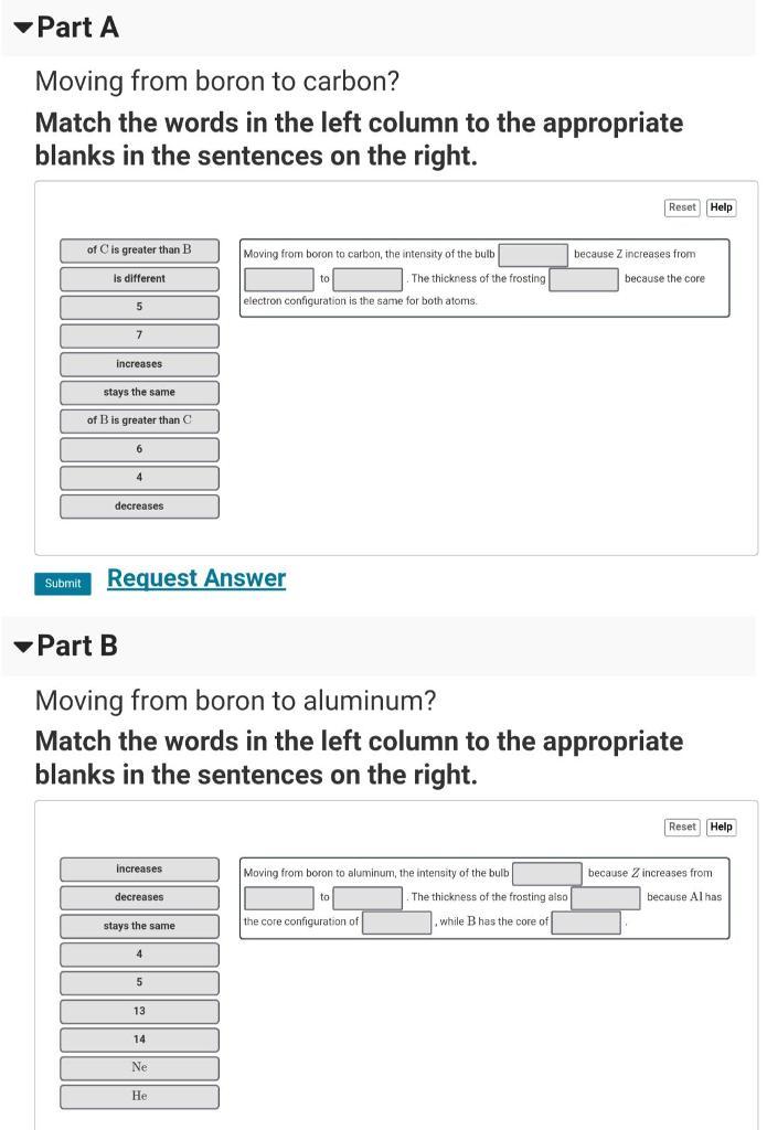 Moving from boron to aluminum the intensity of the bulb <u>Increases</u> because Z increases from <u>5</u> to <u>13</u> . The thickness of the frosting also <u>increases</u> because Al has the core configuration of <u>Ne</u>, while B has the core configuration of <u>He</u>