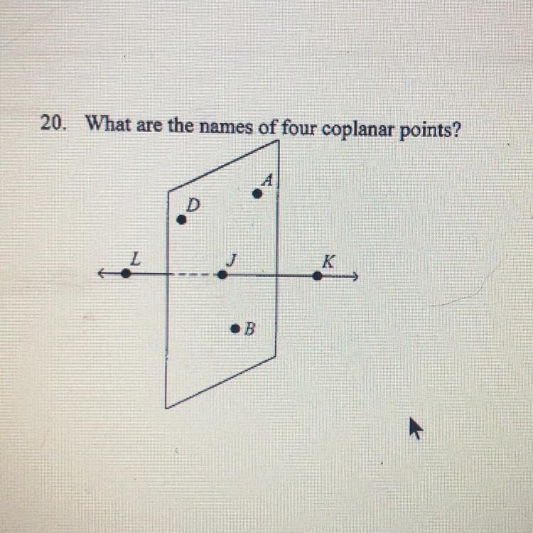 Only points L and K are outside of this plane. So if we listed {L, D, A, J} then that list of points isn't coplanar.